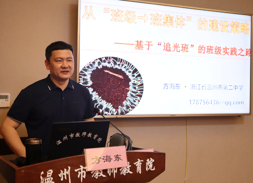 当天晚上,浙江省德育特级教师方海东老师带来专题讲座《从班级到班集体的建设策略》。他指出集体荣誉感不是班级本来就应该有的,而是在班级建设过程中逐步呈现出来的;做班级建设要有“建设”思维,这样才能引导班级的发展;班级不只是孩子们学习的地方,更是生活的地方,带一个班的切入点就是思考学生要什么。他以“追光班”的班级实践为例,理论结合实际,阐释了班级的有效管理以及成功的班级构建框架,深入浅出地讲述了如何完成从一个班到一个班集体的蜕变,为我们的带班方略指明了方向。