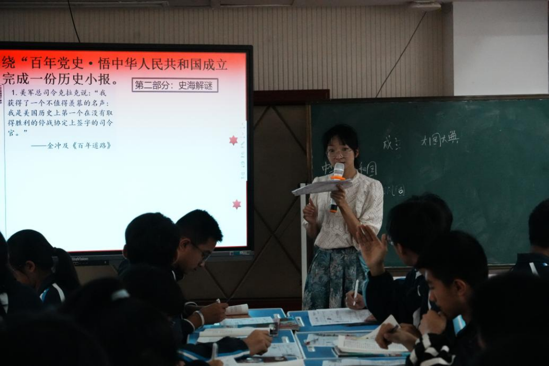 第二节教学展示由同样来自文成县二源镇中心学校的周丽萍老师带来八年级下册历史复习课《中华人民共和国的成立与巩固》。周老师的历史小报《百年的党史:悟中华人民共和国成立和巩固》版面规整,内容丰富,逻辑清晰,设计精巧,别开生面,颇具特色。在课堂驾驭上,周老师情绪高昂充满活力,教学活动井然有序,师生互动思维碰撞。